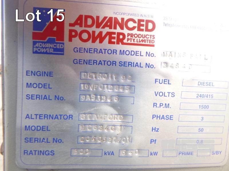 STANDBY GENERATOR, ADVANCED POWER MOD: MAINS FAIL 800KVA S/NO: 34840 DETROIT TWIN TURBO SUPERCHARGED V16 DIESEL STAMFORD 640kw ALTERNATOR 240/415V, E-STOP STEEL FRAME BASE, LIFTING LUGS