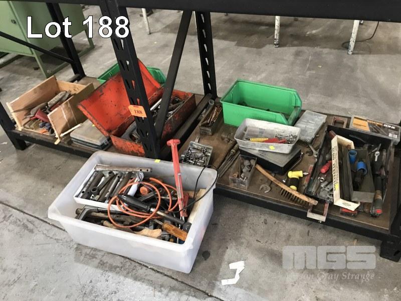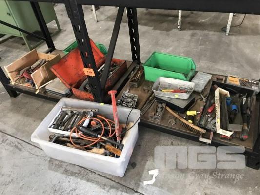 ASSORTED HAND TOOLS, FILES, SOCKETS, SAW, HMMERS, ETC, CONTENTS BOTTOM SHELF
