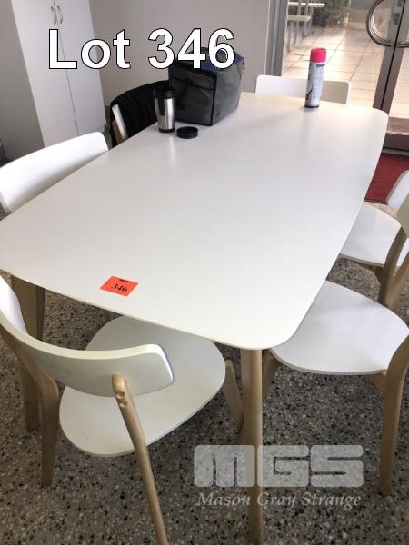WHITE TIMBER LAMINATE KITCHEN TABLE, 1570 x 900mm & 6 x CHAIRS
