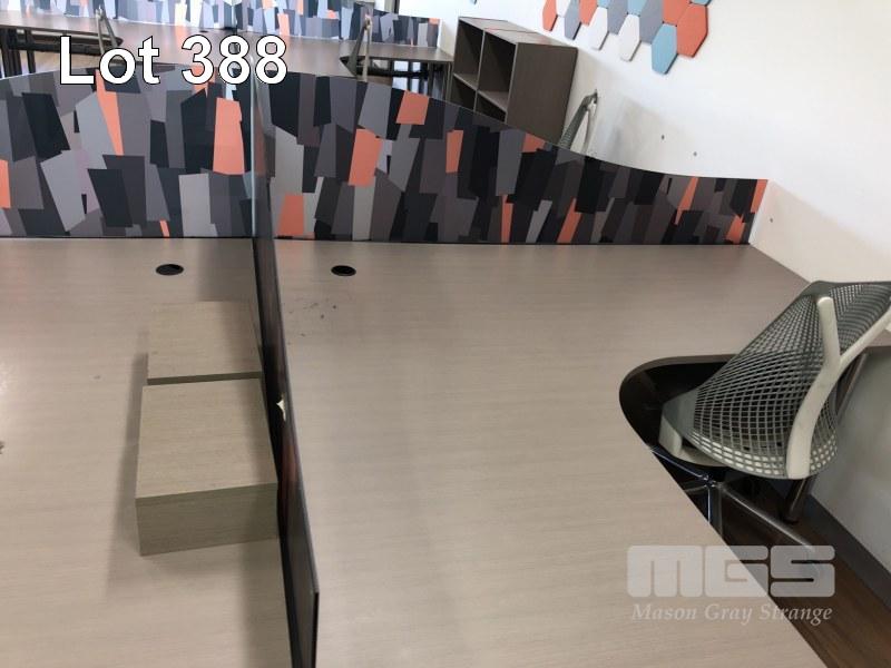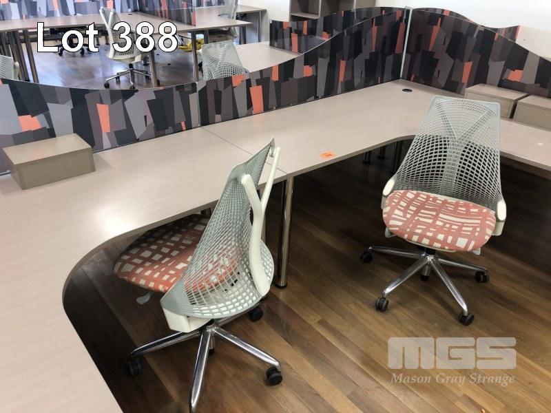 6 PERSON WORK STATION COMPRISING 6 x TIMBER LAMINATE, L-SHAPED DESKS, 1800 x 1800mm, GLASS PARTITIONS, CHROME LEGS & 6 x CHAIRS