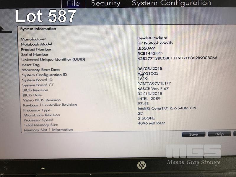 LAPTOP, HP PROBOOK 6560b (LE550AV), CORE i5 2540M (2ND GEN) @ 2.6GHz, 4GB DDR3 RAM, 250GB SATA HDD, DVD-RW, 15.6" WIDESCREEN (1366x768), INTEL HD VIDEO, Wi-Fi, BLUETOOTH, WINDOWS 7 PRO INSTALLED W/ LICENSE & POWER SUPPLY (NOTE: SCREEN LATCHES MISSING) S/N:5CB1443FPD