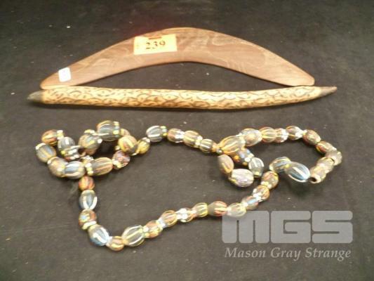INDIGENOUS STYLE BEAD NUTS, STICK & CARVED BOOMERANG