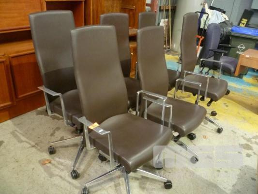 SET OF 6 DESIGNER FIXED HIGH BACK EXECUTIVE MUGA 2 CHAIRS, DESIGNED BY JORGE PENSI FOR AKABA FURNITURE, FULLY UPHOLSTERED LEATHER, POLISHED ALUMINIUM ARMRESTS, SYNCHRO 11 POSITION MECHANISM WITH ADJUSTABLE HEIGHT SEAT, CASTOR AUTO BRAKING (RRP PER CHAIR $2,500)