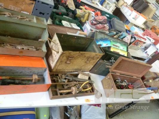 ASSORTED VINTAGE TOOL BOXES & CONTENTS, 1 x TABLE