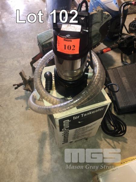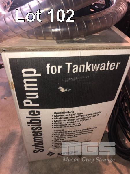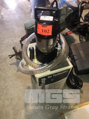 ONGA SUBMERSIBLE PUMP, 240V, AS NEW TANK BUDDY OTB450W WITH HOSE