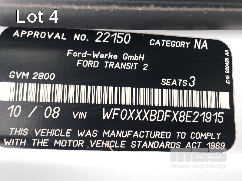 10/2008 (CP) FORD TRANSIT 110 T280 REFRIGERATED VAN REG: S761 ADK VIN: WF0XXXBDFX8E21915 ODO: 184,253kms SHOWING 4 CYLINDER, 5 SPEED MANUAL TRANSMISSION, DIESEL, WHITE DUCO, 3 DOORS, 3 SEAT, FWD ABS, AIR BAG, AIR CON, BLUETOOTH, CD PLAYER, POWER WINDOWS, SCAME DIGITAL CONTROL FRIDGE UNIT KEY #30 (WITH 1 KEY/S) CONDITION: - CENTRAL LOCKING HAS ISSUES - WINDSCREEN SIDE TRIM MISSING - RUST EVIDENT