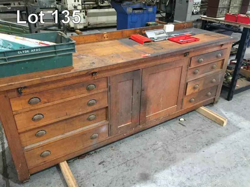 TIMBER WORK BENCH, 230 x 63cm, 8 x DRAWER/2 x DOOR