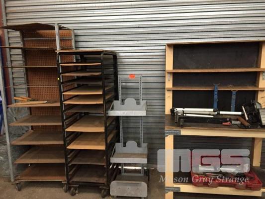TIMBER WORK BENCH & 3 x ASSORTED TROLLEYS