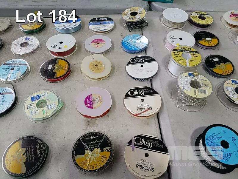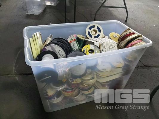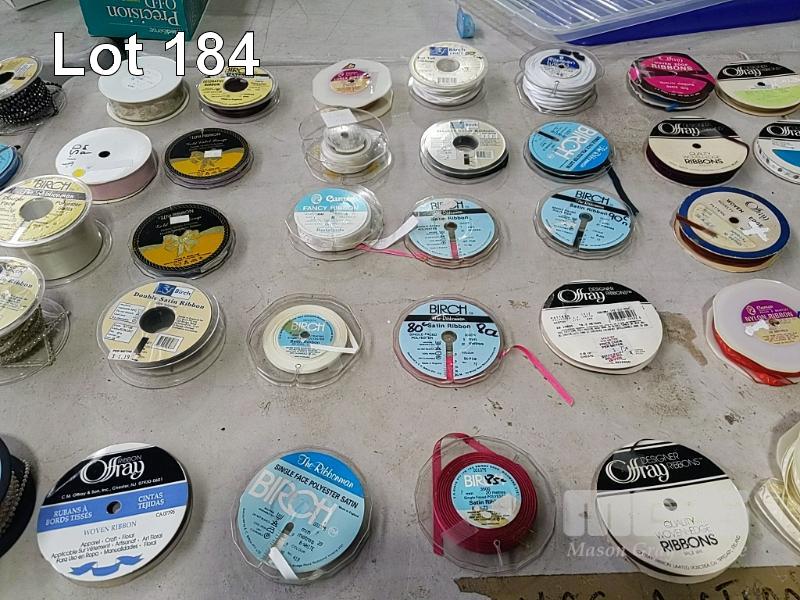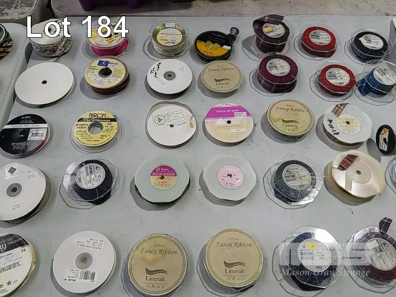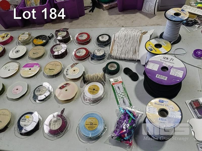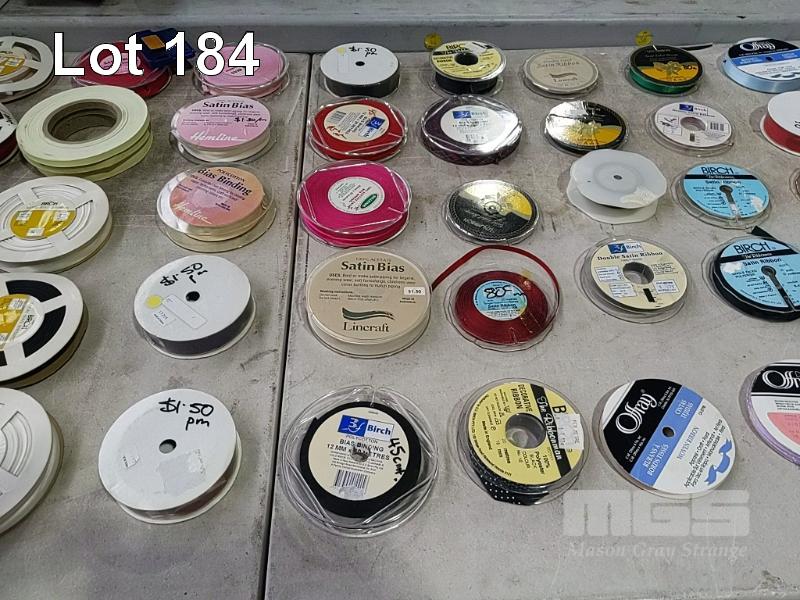 QUANTITY OF ASSORTED SPOOLED CRAFT & HOBBY RIBBON, BRAID, TRIMMING, BIAS BINDING TAPE, BLANKET BINDING TAPE, BRAIDED ELASTIC, KNITTED ELASTIC ETC. HUGE VARIETY ESTIMATED 250 ITEMS. ALSO 3 x SIMCO RIBBON STANDS. (1 x TUB + STANDS).