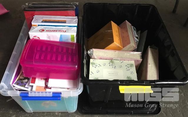 2 X TUBS CONTAINING OFFICE STATIONARY & SUPPLIES, TRIVIAL PURSUIT, GENIUS 2 EDITION & GIFT BOX SETS