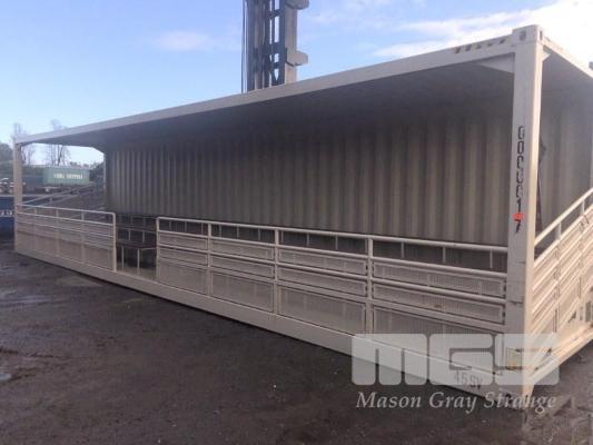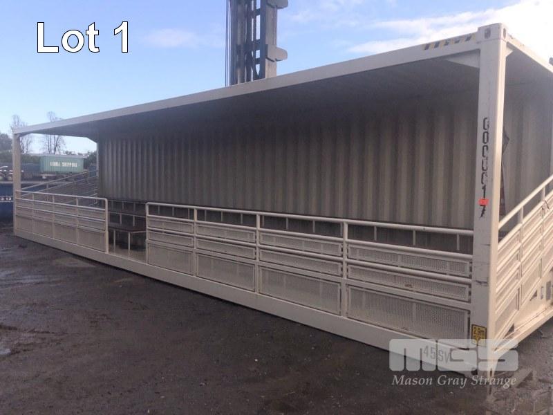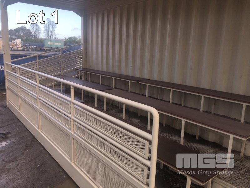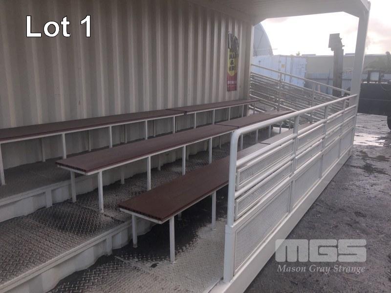TRANSPORTABLE 3 TIER GRANDSTAND 40' (12.20m) (L) APPROX x 8' (2.40m) (W) x 9.44' (2.88m) (H) COMPOSITE DECK SEATING WITH STEEL FRAMES APPROX 60 PERSON SEATING CAPACITY, SAFETY HAND RAILING, ROOF & BACK WALL, OPEN FRONT & SIDES, FITTED WITH CONTAINER PIN SOCKETS