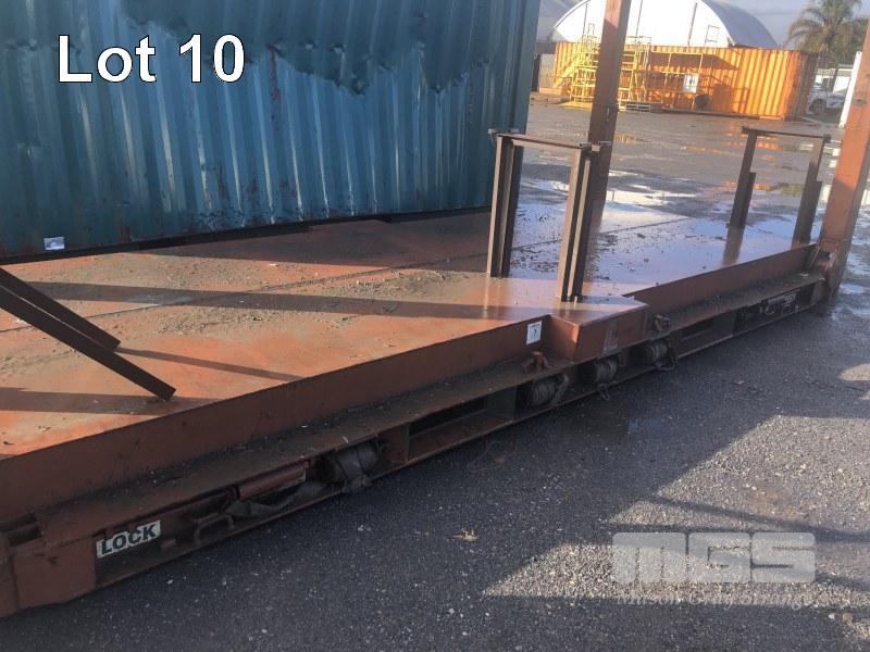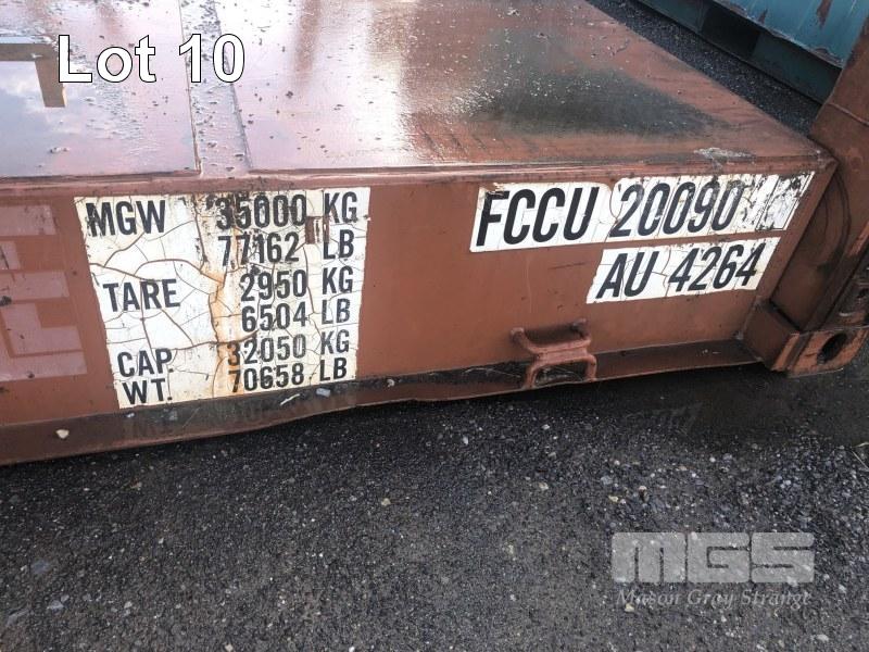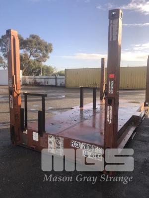 20' CONTAINER SHIPPING BASE, FLAT RACK. 4 x CORNER FOLDED DOWN POSTS FORK POCKETS NO: FCCU20090 CAP: 32,050kg TARE: 2,950kg