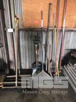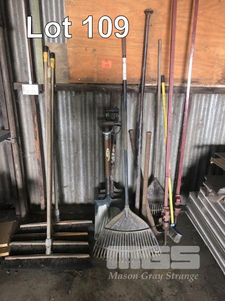 ASSORTED SHOVELS, BROOMS, PICK, 2 x SASH CLAMPS, 2400mm, ETC