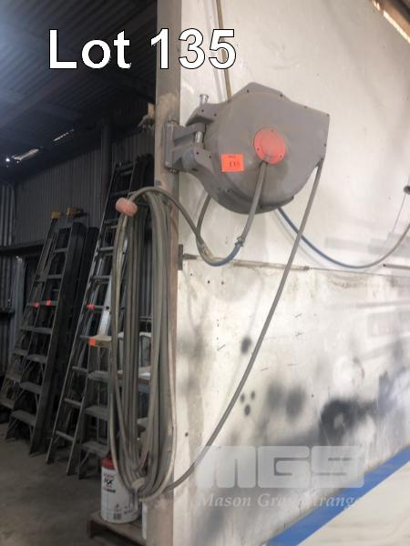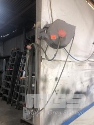 RETRACTABLE AIR HOSE REEL, MOUNTED TO BUILDING (BUYER TO REMOVE)