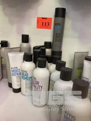 20 (APPROX) x BOTTLES ASSORTED KMS HAIR PRODUCTS INCLUDING COLOR VITALITY, ADDS VOLUME SHAMPOO, THERMA SHAPE, MOIST REPAIR GEL & HAIR STAY