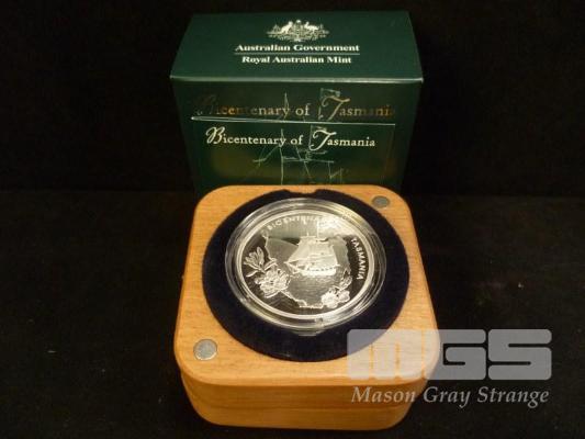 2004 PROOF 1 OZ FINE SILVER "BICENTENARY OF TASMANIA" $5 COIN WITH COA