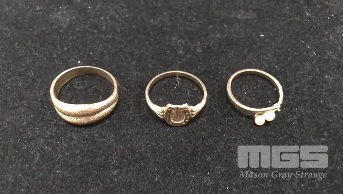 3 x GOLD RINGS, 1 x HORSE SHOE SIGNET, 1 x WAVE PATTERN, 1 x PEARL SETTING (1 x PEARL MISSING), 9ct, 7.8gm