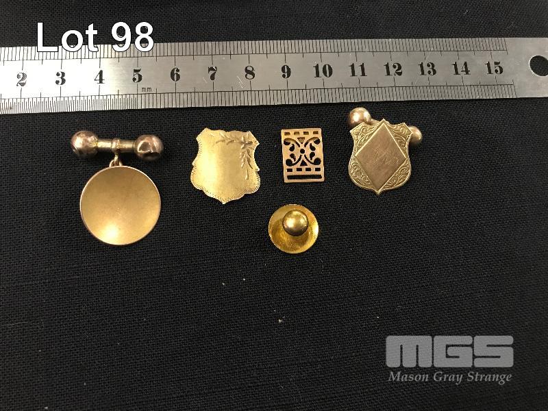 3 x GOLD NON-MATCHING CUFF LINKS, SHIELD CLIP & PENDANT, 9ct, 7.6gm TOTAL WEIGHT
