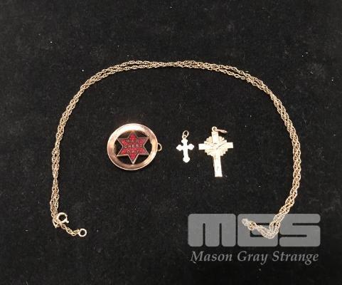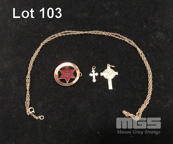3 x GOLD PENDANTS, 2 x CRUCIFIX, 1 x WAR CHEST DAY STAR, 1 x GOLD CHAIN, 9ct, 7.4gm