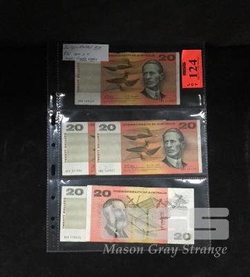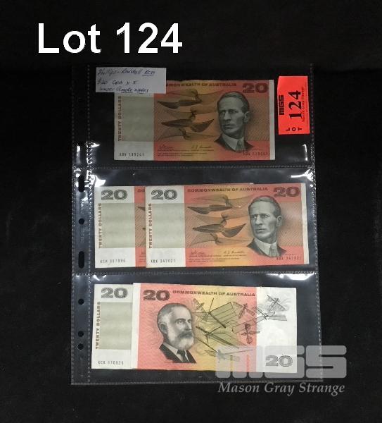 5 X AUSTRALIAN TWENTY DOLLAR PAPER BANKNOTES, PHILLIPS/RANDALL, X PREFIXES