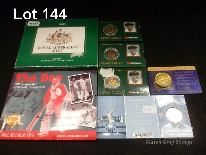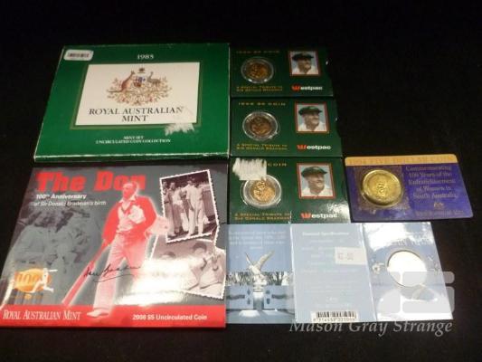 AUSTRALIA, UNCIRCULATED COINS & MINT SET, INC; 1985, UNCIRCULATED COIN COLLECTION, 2008, $5, COIN, 100th ANNIVERSARY OF SIR DON BRADMAN 3 X 1996 $5, COINS, 'A SPECIAL TRIBUTE TO SIR DONALD BRADMAN' 1994, $5 COIN, 'COMMEMORATING 100 YEARS OF THE ENFRANCHISEMENT OF WOMEN IN SOUTH AUSTRALIA', 2003, $1, COIN, 'KOREAN WAR', 'C' MINT MARK