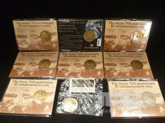 9 X AUSTRALIA, BRONZE, $5 COMMEMORATIVE COINS, INC; 7 X 1990, 'THE ANZAC 75th ANNIVERSARY', 1 X 1988, 'OFFICIAL OPENING OF AUSTRALIA'S PARLIAMENT HOUSE', 1 X 1992, 'THE INTERNATIONAL YEAR OF SPACE'