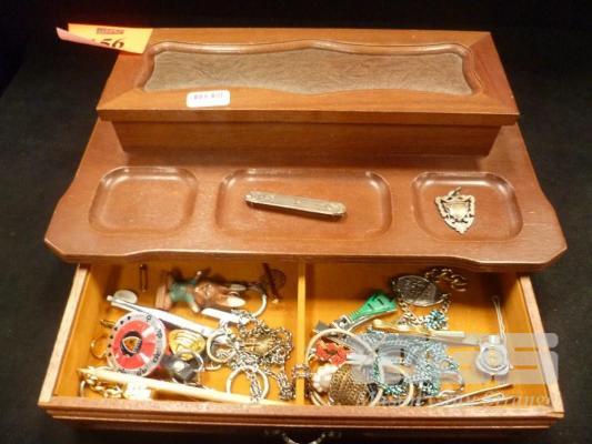 TIMBER JEWELLERY BOX, DRESS JEWELLERY, ETC WITH HALLMARKED SILVER PENDANT, ENGRAVED, 23/3/12