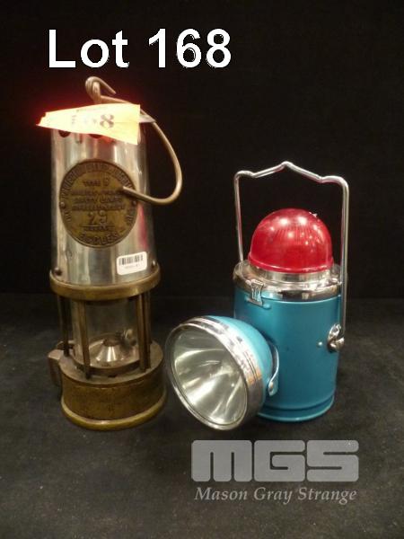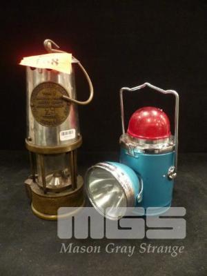 ANTIQUE MINERS LANTERN BY PROTECTOR LAMPS & LIGHTING CO LTD, TYPE 6 WITH GLOBE BRAND BATTERY LANTERN