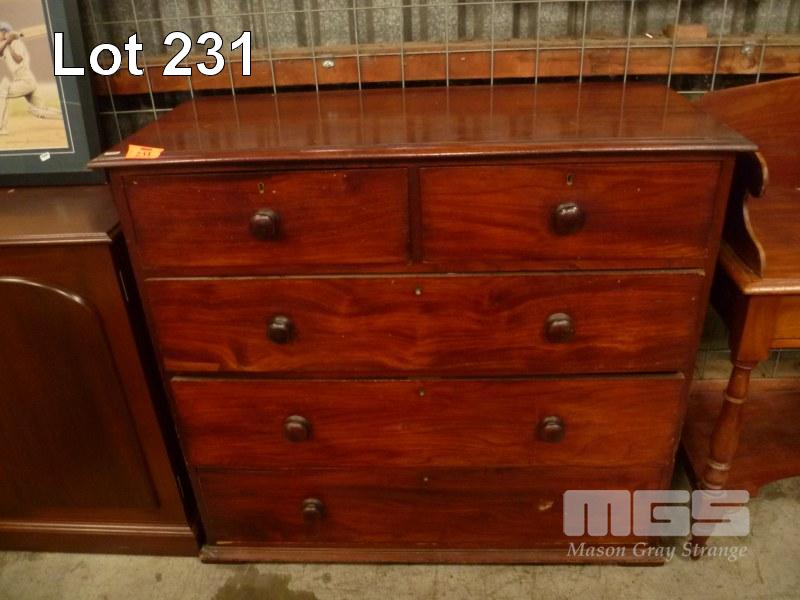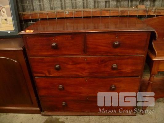 VINTAGE MAHOGANY CHEST 5 DRAWERS, TIMBER HANDLES, (1 x MISSING), NO KEY