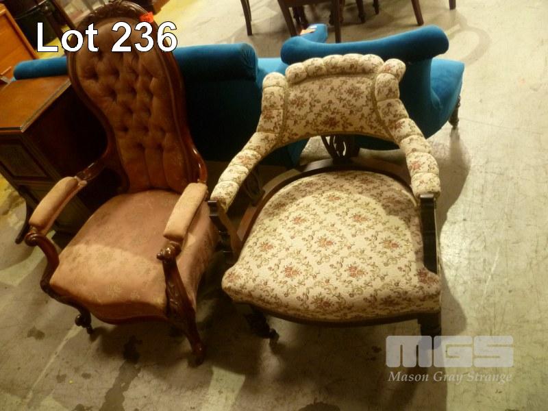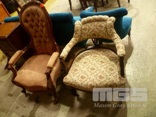 ORNATE TIMBER FRAMED EARLY TUB CHAIR, FLORAL TAPESTRY, ORNATE FRAMED GRANDFATHER CHAIR, CERAMIC CASTORS, DEEP BUTTON, PINK FABRIC