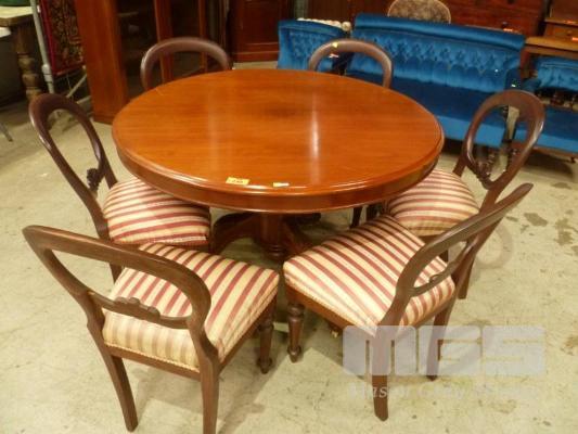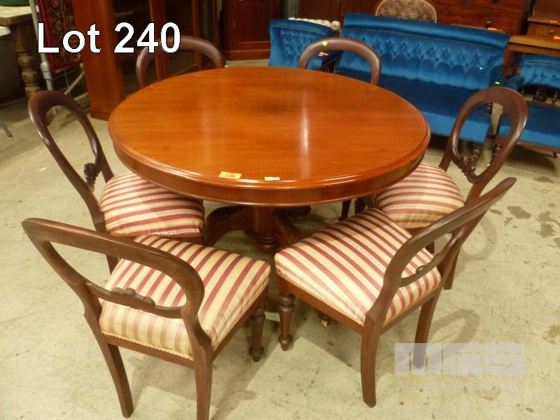 MAHOGANY 7 PIECE DINING SUITE, INC ROUND DINING TABLE, SINGLE PEDESTAL, CARVED FEET, CERAMIC CASTORS & 6 x BALLOON BACK CHAIRS, RED/BEIGE SILK UPHOLSTERED