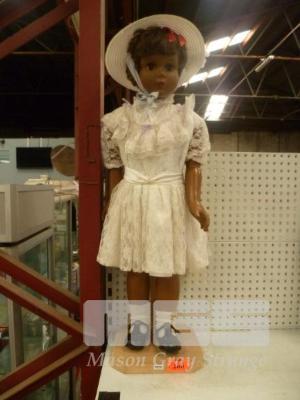 EARLY DRESS DOLL ON STAND, LACE DRESS, SHOES & HAT,MARKED AE3651 TO REAR OF HEAD