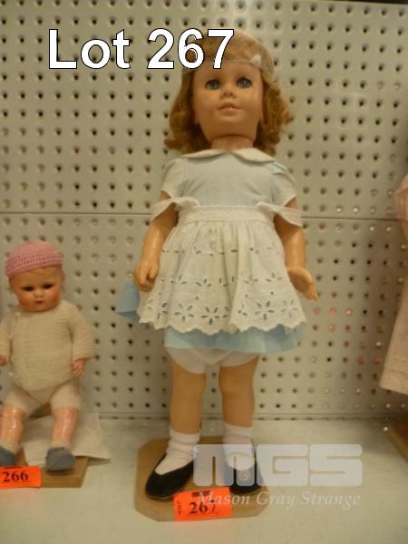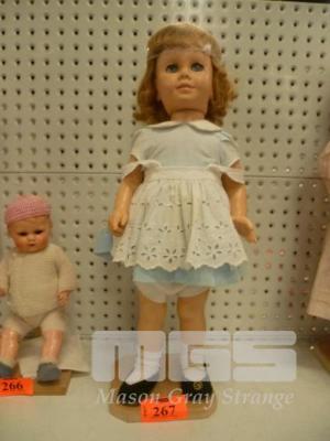 VINTAGE DRESS DOLL ON STAND, CHATTY CATHY, STRING PULL MOVEMENT BY MATTEL USA, BLUE DRESS, APRON & SHOES