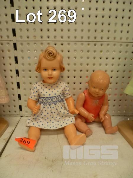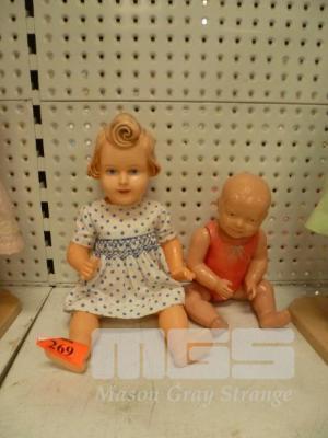 2 X EARLY PLASTIC DOLLS, SMALL GIRL IN WHITE/BLUE POCKER DOT DRESS & BABY