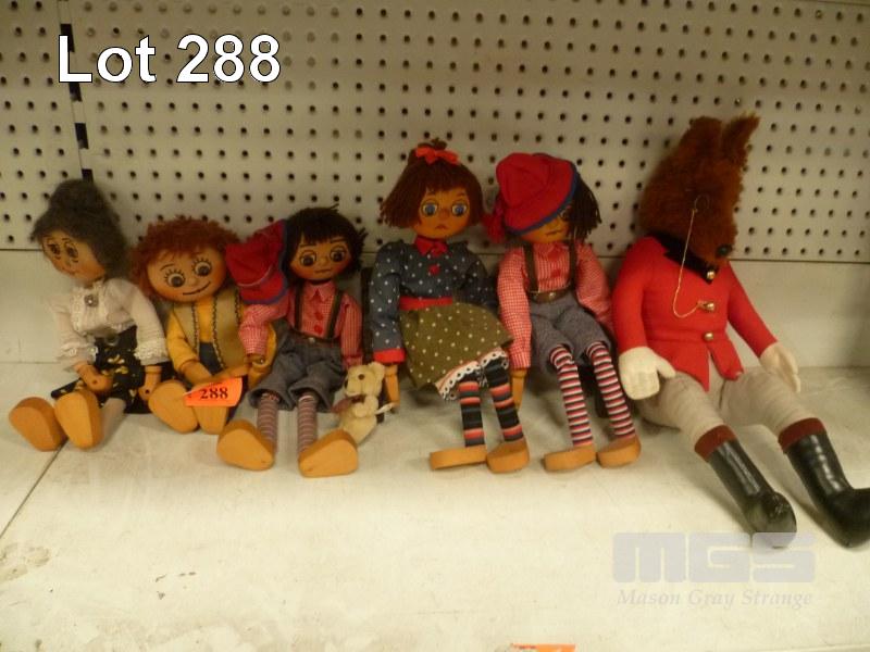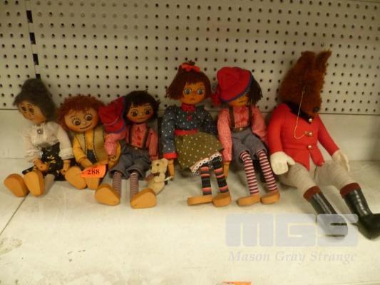 COLLECTION OF 5 WOODEN DOLLS & PLUSH FOX
