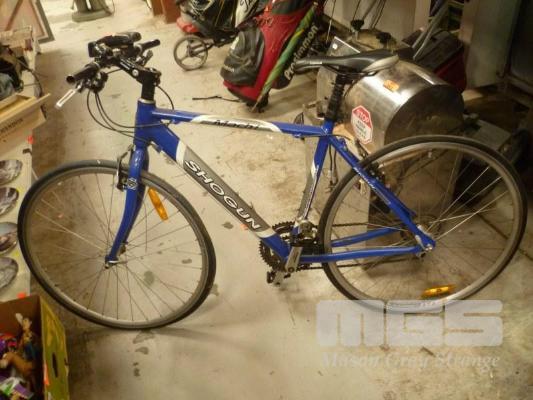 SHOGUN MACH 1 HYBRID BICYCLE, HEAT TREATED ALUMINIUM FRAME, SHIMANO GEARS, 44cm FRAME, NO HANDLEBAR GRIPS, FRONT SPOKE BROKEN
