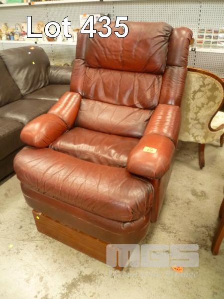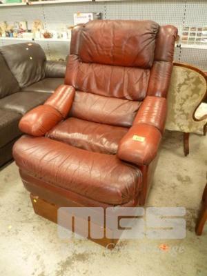 BROWN LEATHER RECLINER ON TIMBER RAISING PLATFORM