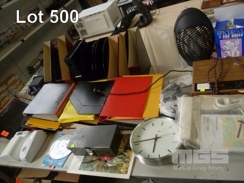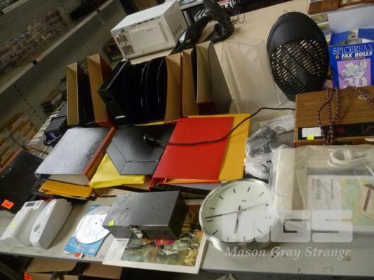 ASSORTED OFFICE FOLDERS, SORTERS, WALL CLOCK, ETC, 1 x TABLE