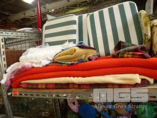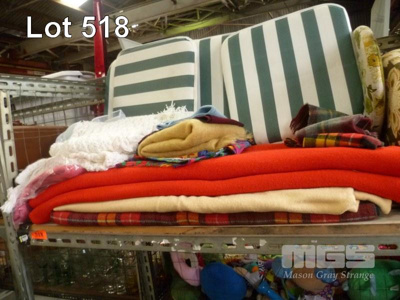 ASSORTED BLANKETS, SCARVES, CUSHIONS, ETC