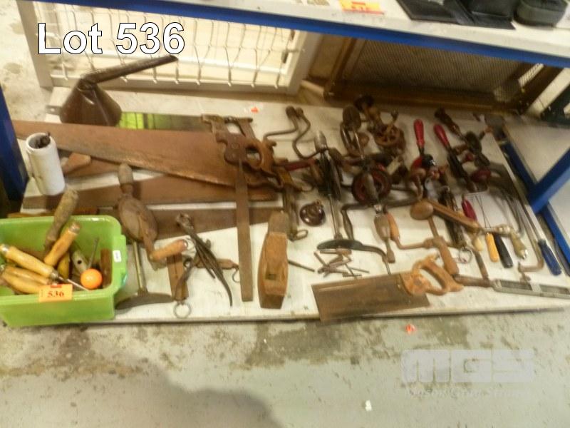 ASSORTED VINTAGE CARPENTERS TOOLS INC SAWS, DRILLS, ETC