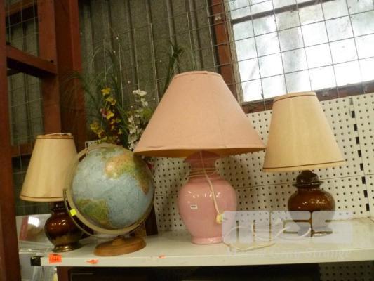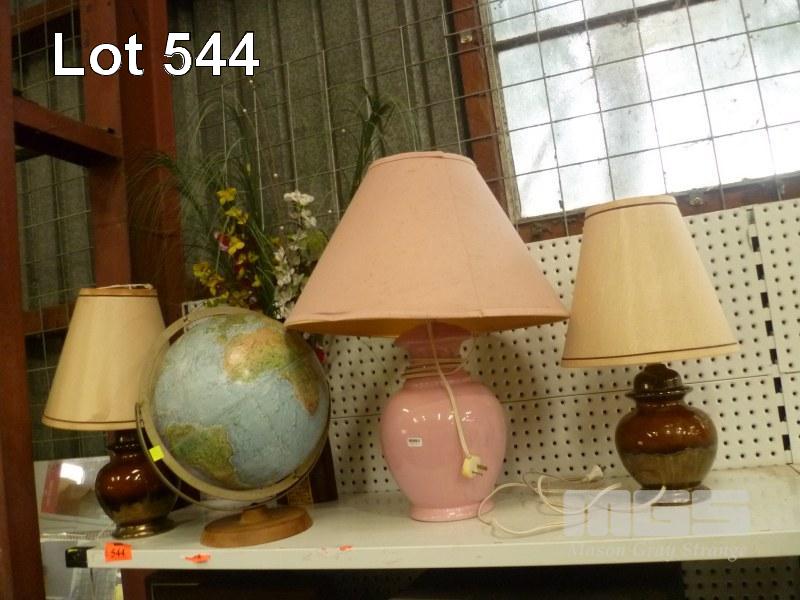 PAIR GLAZED TABLE LAMPS, READERS DIGEST WORLD GLOBE, VASE & FLORAL ARRANGEMENT
