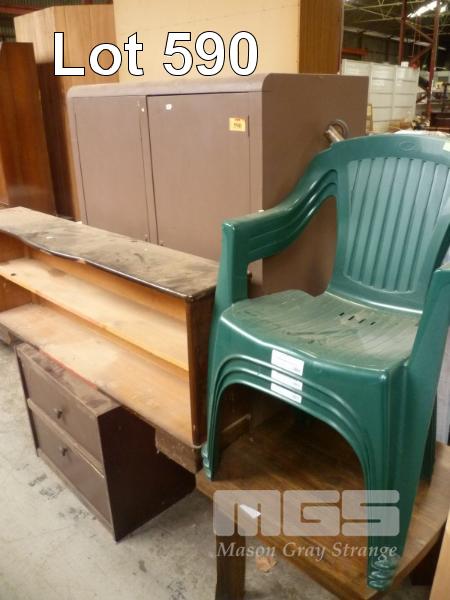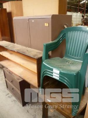 LINEN PRESS, GREEN PLASTIC CHAIRS, ETC