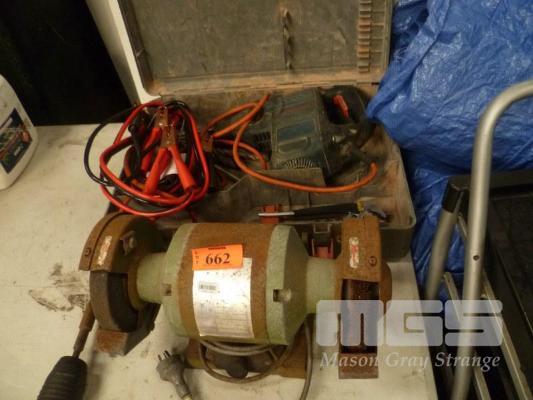 BOSCH HAMMER DRILL, CHEVRON BENCH GRINDER & JUMPER LEADS