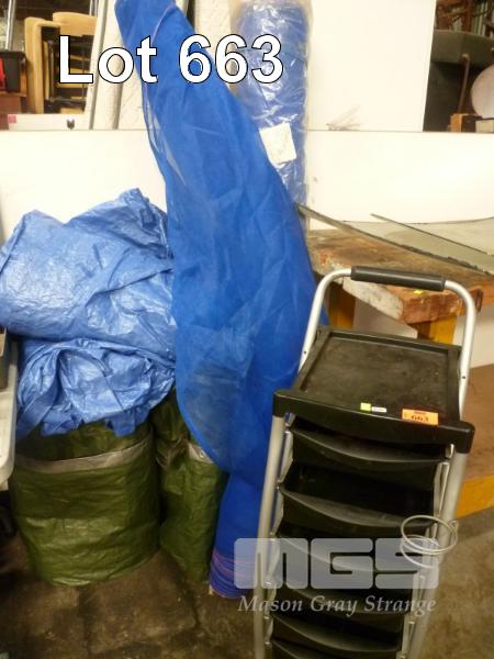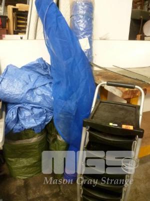BLUE SHADE CLOTH, PLASTIC TARPS & MOBILE DRAWER UNIT