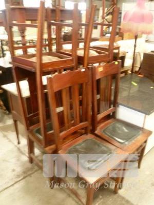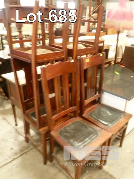 SET 6 VNTAGE TIMBER DINING CHAIRS, HIGH BACKS, BLACK LEATHER SEAT