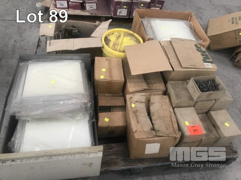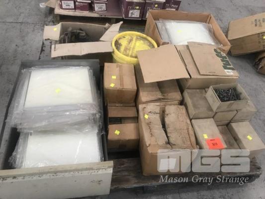 ASSORTED SCREWS, POST FEET, HINGES, PERSPEX DIVIDERS, GREASE GUNS, ETC, 1 x PALLET