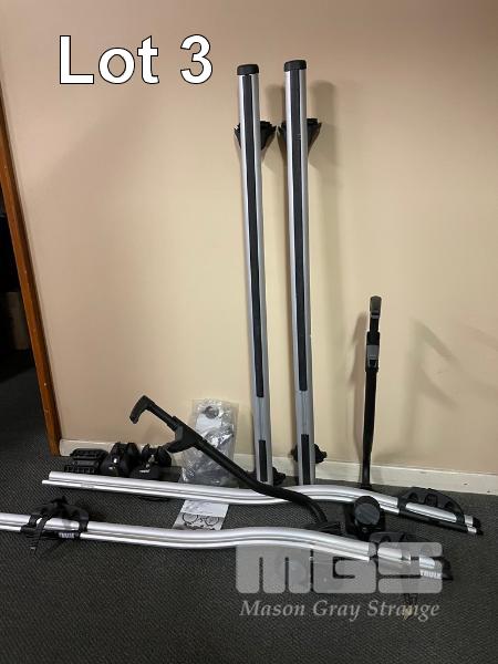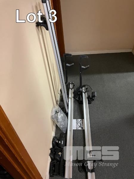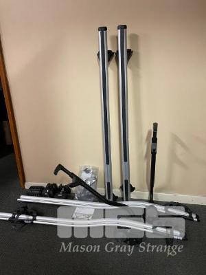 PAIR THULE AERO ROOF BARS 127CM LONG, (MODEL 515-0221), COMPLETE WITH 2 THULE PRORIDE 591 ROOF MOUNT BIKE CARRIERS, 20KG CAPACITY, WITH KEYS