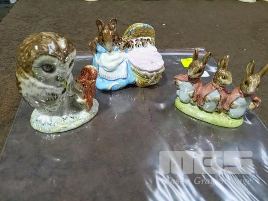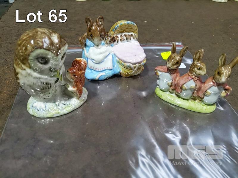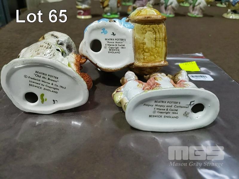BEATRIX POTTER'S "OLD MR BROWN" FIGURINE "(C) FREDERICK WARNE & CO. 1963 LICENSED BY COPYRIGHTS BESWICK ENGLAND" BEATRIX POTTER'S "HUNCA MUNCA" FIGURINE "F. WARNE & CO.LTD. (C) COPYRIGHT 1951 BESWICK ENGLAND" BEATRIX POTTER'S "FLOPSY, MOPSY AND COTTONTAIL" FIGURINE "F. WARNE & CO.LTD. (C) 1954 BESWICK ENGLAND"