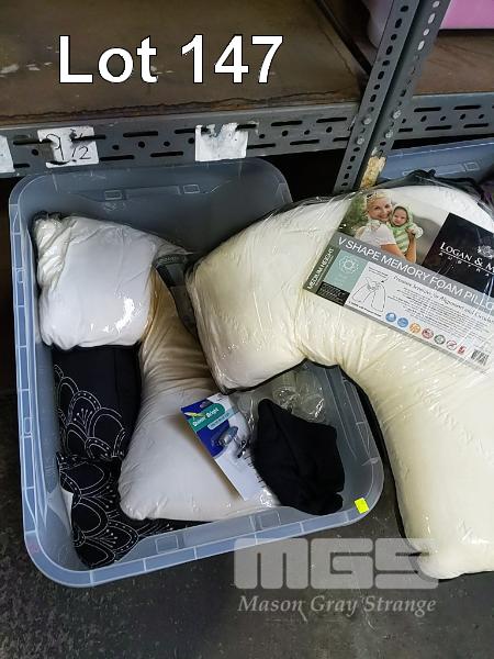 V-SHAPED MEMORY FOAM CLOSE, THROW CUSHIONS AND BATH TOWELS ETC, ALL NEW UNUSED (3 x TUBS)