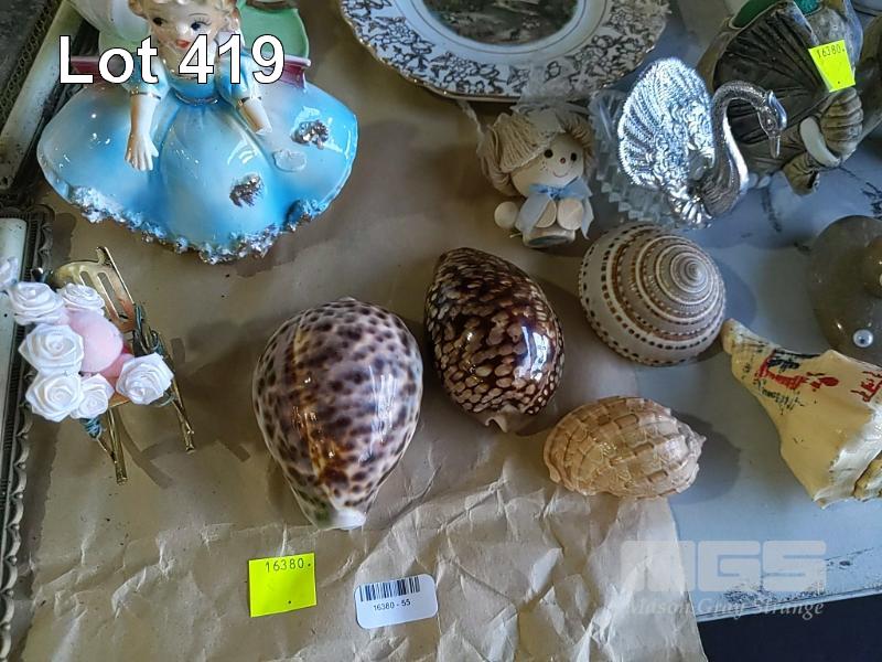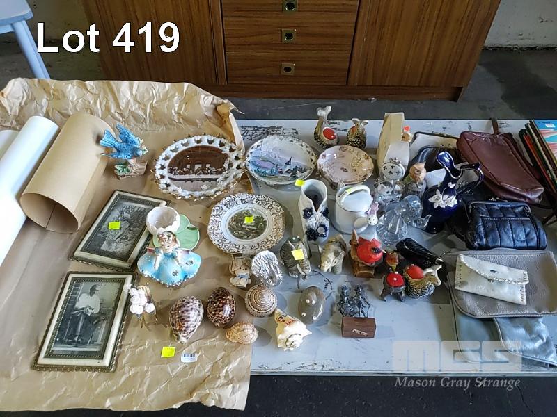 COLLECTED CURIOS AND OTHER HOME OBJECTS INCLUDING VINTAGE PURSES, VINTAGE PICTURE FRAMES, CHINA PLATES, SHELLS INCLUDING 2 x LEOPARD SHELLS AND PRINTS INCLUDING 2 x COPIES OF MARGARET SLAPE'S "COORONG - SOUTH AUSTRALIA"